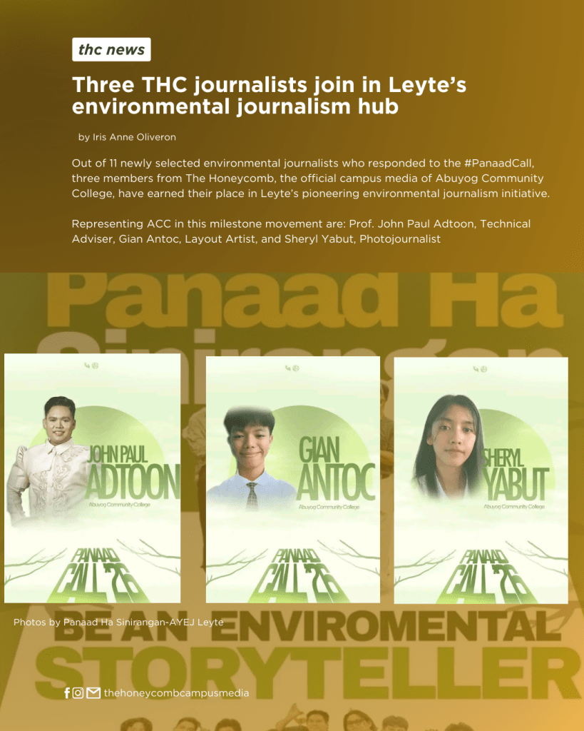 - ๐ง๐ต๐ฟ๐ฒ๐ฒ ๐ง๐๐ ๐ท๐ผ๐๐ฟ๐ป๐ฎ๐น๐ถ๐๐๐ ๐ท๐ผ๐ถ๐ป ๐ถ๐ป ๐๐ฒ๐๐๐ฒโ๐ ๐ฒ๐ป๐๐ถ๐ฟ๐ผ๐ป๐บ๐ฒ๐ป๐๐ฎ๐น ๐ท๐ผ๐๐ฟ๐ป๐ฎ๐น๐ถ๐๐บ ๐ต๐๐ฏ ๐ฃ๐บ ๐๐ณ๐ช๐ด ๐๐ฏ๐ฏ๐ฆ ๐๐ญ๐ช๐ท๐ฆ๐ณ๐ฐ๐ฏ๐ง๐ต๐ฟ๐ฒ๐ฒ ๐ง๐๐ ๐ท๐ผ๐๐ฟ๐ป๐ฎ๐น๐ถ๐๐๐ ๐ท๐ผ๐ถ๐ป ๐ถ๐ป ๐๐ฒ๐๐๐ฒโ๐ ๐ฒ๐ป๐๐ถ๐ฟ๐ผ๐ป๐บ๐ฒ๐ป๐๐ฎ๐น ๐ท๐ผ๐๐ฟ๐ป๐ฎ๐น๐ถ๐๐บ ๐ต๐๐ฏ๐ฃ๐บ ๐๐ณ๐ช๐ด ๐๐ฏ๐ฏ๐ฆ ๐๐ญ๐ช๐ท๐ฆ๐ณ๐ฐ๐ฏ After a week-long opening of applications, the call has been answered and Abuyog Community College (ACC) is proudly in the spotlight. Out of 11 newly selected environmental journalists continue reading : ๐ง๐ต๐ฟ๐ฒ๐ฒ ๐ง๐๐ ๐ท๐ผ๐๐ฟ๐ป๐ฎ๐น๐ถ๐๐๐ ๐ท๐ผ๐ถ๐ป ๐ถ๐ป ๐๐ฒ๐๐๐ฒโ๐ ๐ฒ๐ป๐๐ถ๐ฟ๐ผ๐ป๐บ๐ฒ๐ป๐๐ฎ๐น ๐ท๐ผ๐๐ฟ๐ป๐ฎ๐น๐ถ๐๐บ ๐ต๐๐ฏ ๐ฃ๐บ ๐๐ณ๐ช๐ด ๐๐ฏ๐ฏ๐ฆ ๐๐ญ๐ช๐ท๐ฆ๐ณ๐ฐ๐ฏ
