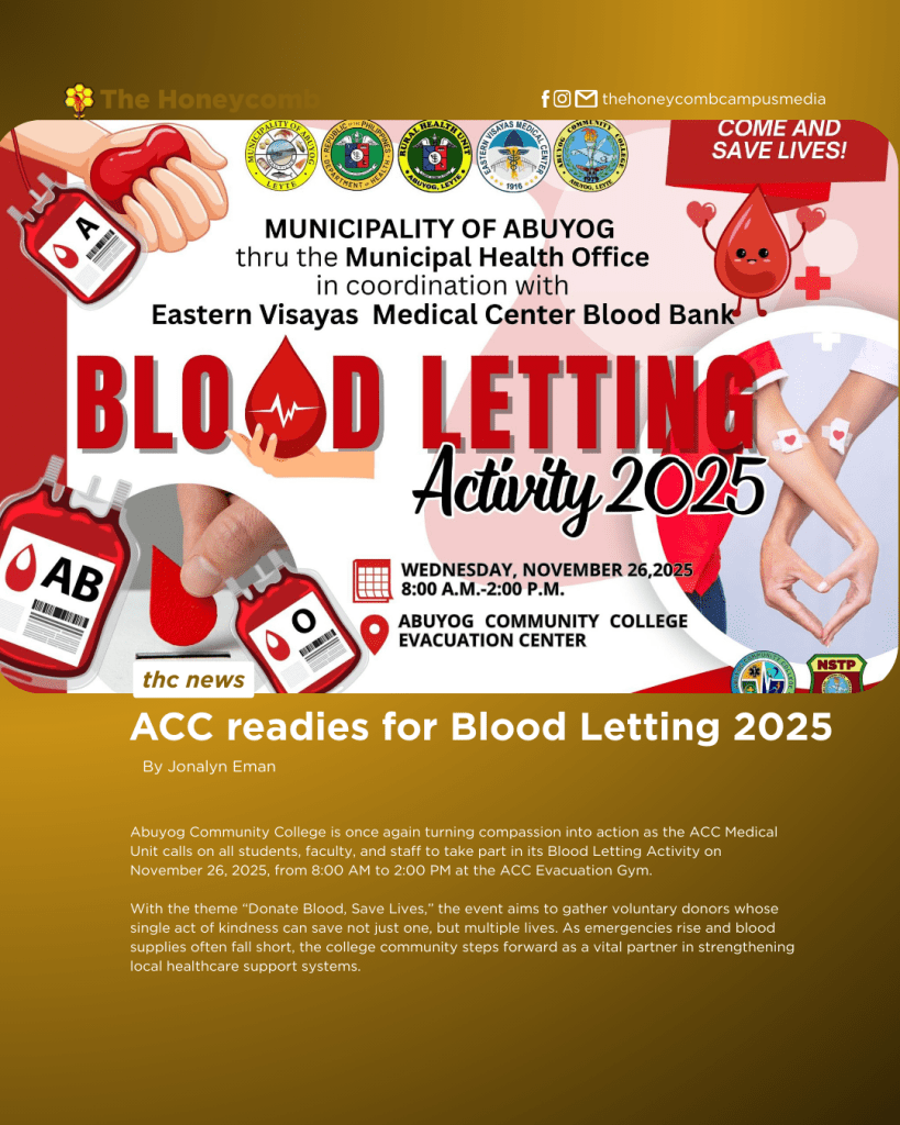 Abuyog Community College is once again turning compassion into action as the ACC Medical Unit calls on all students, faculty, and staff to take part in its Blood Letting Activity on November 26, 2025, from 8:00 AM to 2:00 PM at the ACC Evacuation Gym.