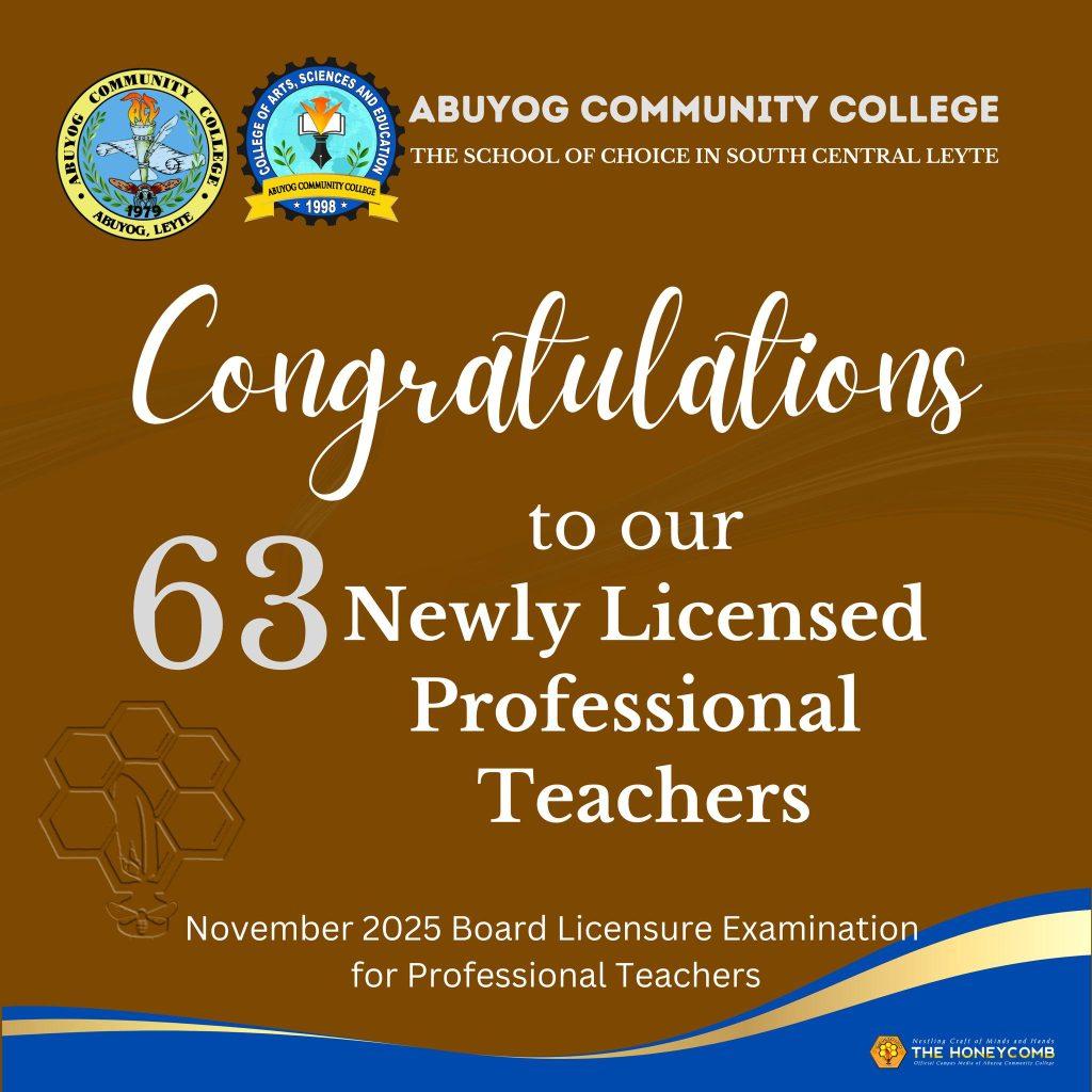 The spirit of Christmas shines brighter at Abuyog Community College as the institution proudly celebrates the success of its 63 brave and determined graduates who passed the November 2025 Board Licensure Examination for Professional Teachers (BLEPT).