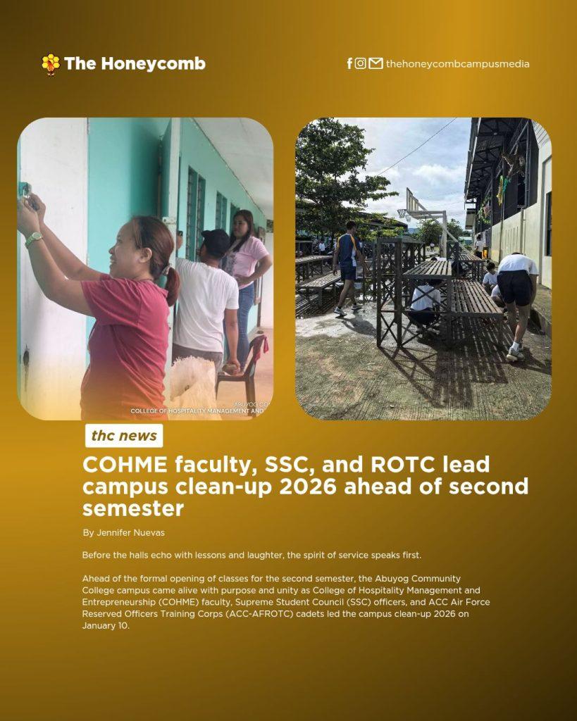 Ahead of the formal opening of classes for the second semester, the Abuyog Community College campus came alive with purpose and unity as College of Hospitality Management and Entrepreneurship (COHME) faculty, Supreme Student Council (SSC) officers, and ACC Air Force Reserved Officers Training Corps (ACC-AFROTC) cadets led the campus clean-up 2026 on January 10.